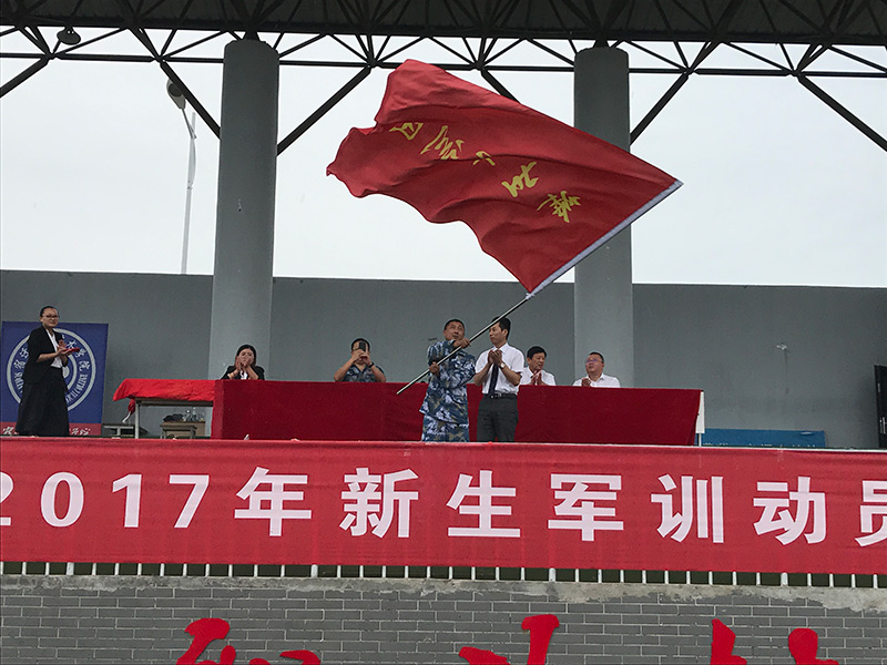 参训学子英姿飒爽、严阵以待,气氛隆重而热烈,展现了青春蓬勃、奋发向上的士气与精神风貌,杨晓龙院长为军训团授旗。